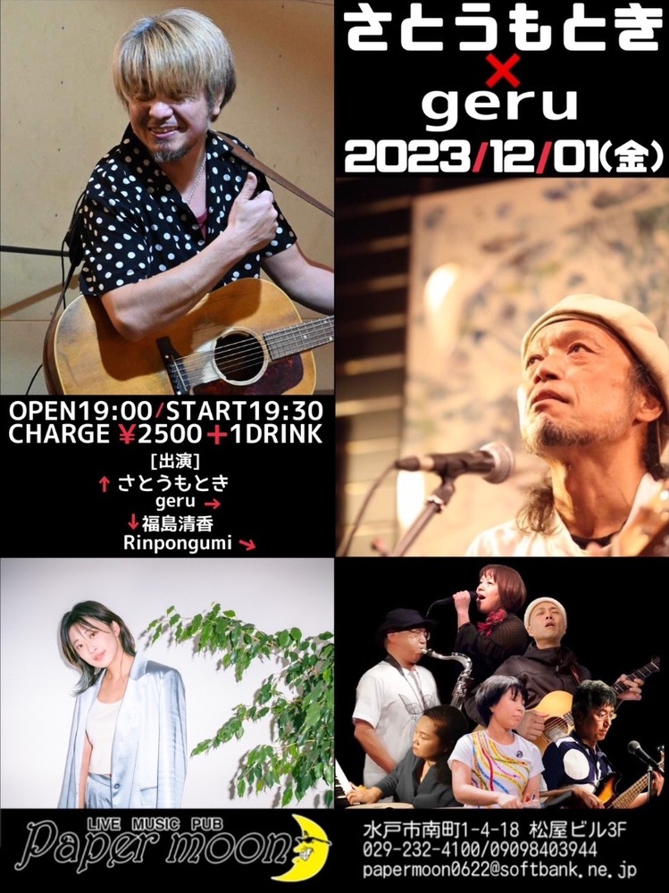 12月1日水戸ペーパームーン schedule 2023/12/01(金) 20:10 - 水戸ペーパームーン 地図を表示 水戸 さとうもとき×geru LIVE @PAPERMOON 2023/12/01(金) OPEN19:00/START19:30 CHARGE¥2500+1DRINK [出演] さとうもとき geru 福島清香 リンポングミ [TIME TABLE] 19:00 OPEN 19:30→20:00リンポングミ 20:10→20:40 福島清香 20:50→21:20 geru 21:30→22:00 さとうもとき URLをコピーする 報告する
