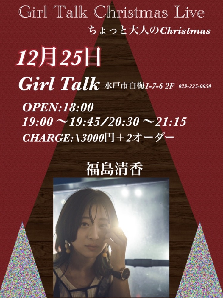 ガールトーククリスマスライブ schedule 2024/12/25(水) 18:30 - 水戸ガールトーク SHOWTIMES:19:00/20:30 OPEN:18:00 3000円+2オーダー URLをコピーする 報告する