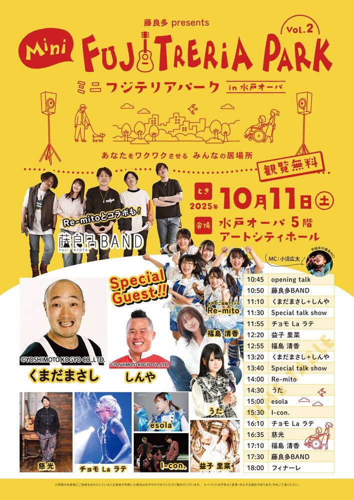 フジテリアパーク schedule 2025/10/11(土) 12:55 - 水戸OPA5階アートシティホール 12:55〜 17:10〜 どちらも物販あり(5階) 最後藤君とコラボ?! URLをコピーする 報告する