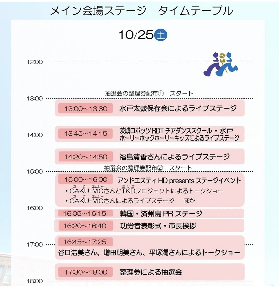 水戸漫遊マラソン前日祭 schedule 2025/10/25(土) 14:20 - 水戸県立図書館、旧県庁前 14:20〜14:50演奏 抽選会も登壇してトークします☺︎ URLをコピーする 報告する