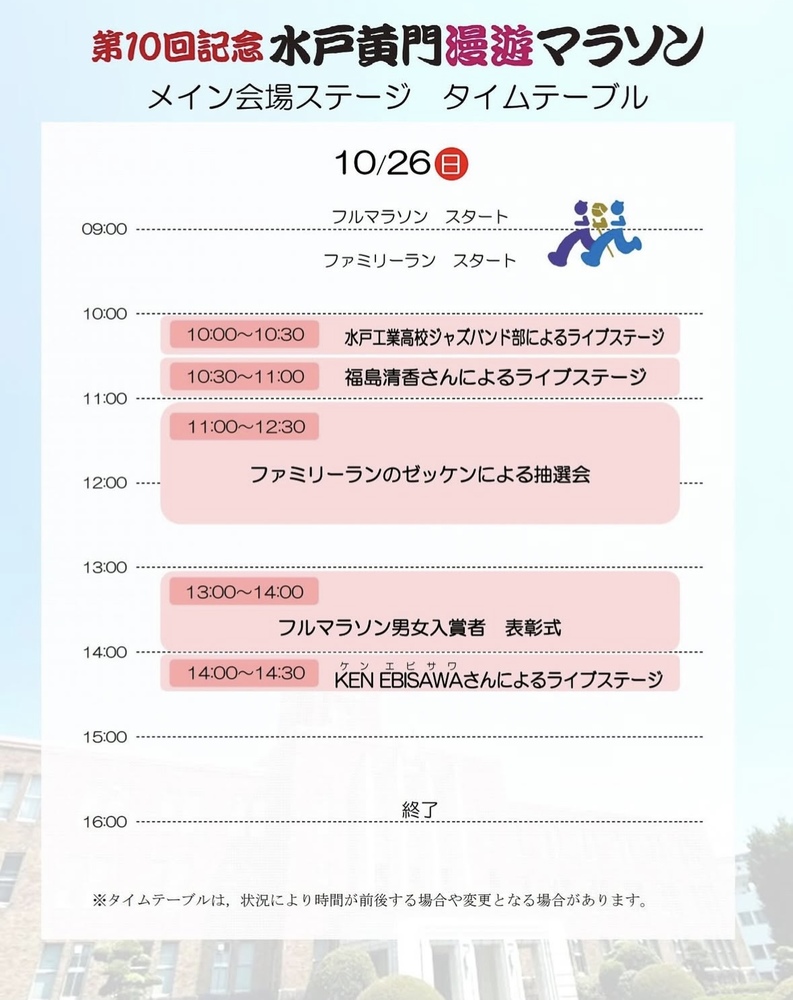 水戸漫遊マラソン当日 schedule 2025/10/26(日) 10:30 - 三の丸庁舎県立図書館前ステージ ファミリーランを一緒に走る 10:30〜11:00 子供向けセトリステージ 三の丸庁舎県立図書館前 URLをコピーする 報告する