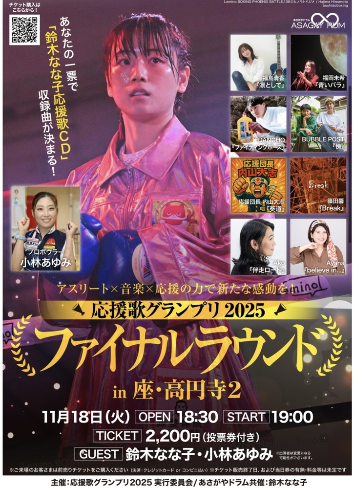 主題歌争奪ファイナル 高円寺 schedule 2025/11/18(火) 19:00 - 座・高円寺2 集客によってポイントが加算されます。 ポイント上位の人はボクサー鈴木なな子さんの応援主題歌を担当し、CDになります。 本番は 凛として エントリー曲1曲のみの演奏となります。 初めての素敵なホールでの演奏です! 18:30op URLをコピーする 報告する